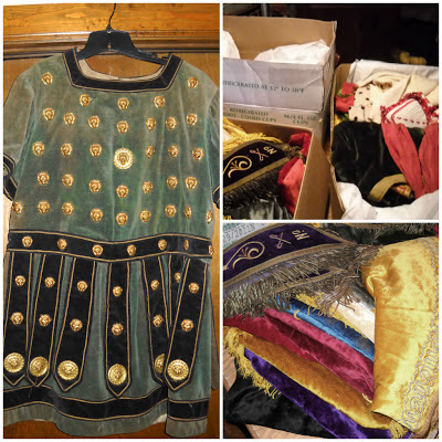 I was excited to find old fraternal lodge capes, sashes and more.........the colors, the fabrics.....one garment had a jillion of these lion head buttons sewn on it. Of course I had to have it! The sashes have oodles of the old metal fringe and tassels, I do love tassels........the fabrics will make wonderful make-do's.